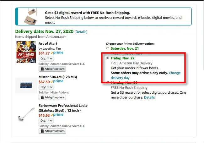 ตัวอย่างหน้าการชำระสินค้าบนเว็บไซต์ Amazon ที่ระบุวันที่ ๆ สินค้าจะส่งถึงหน้าบ้านผู้รับ  พร้อมข้อเสนอที่สามารถเปลี่ยนวันส่งสินค้าได้